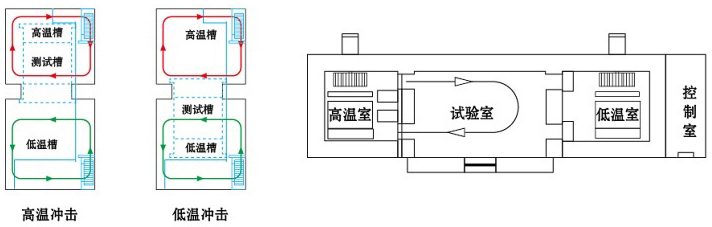 兩廂設備區分為高溫區和低溫區兩部分,測試產品置于提籃中,沖擊時提籃將測試產品移近高溫區或低溫區進行沖擊,測試產品為動態式。 采用觸控式操作界面,操作簡易TEMI8229,沖擊箱專用儀表,智能操作。 沖擊方式應用風路切換方式將溫度導入測試區,做冷熱沖擊測試。 高溫沖擊或低溫沖擊時,時間不低于999H,循環周期不小于9999次。系統可做自動循環或手動選擇性沖擊。 降溫效果快,不可以試驗沖擊常溫。 |